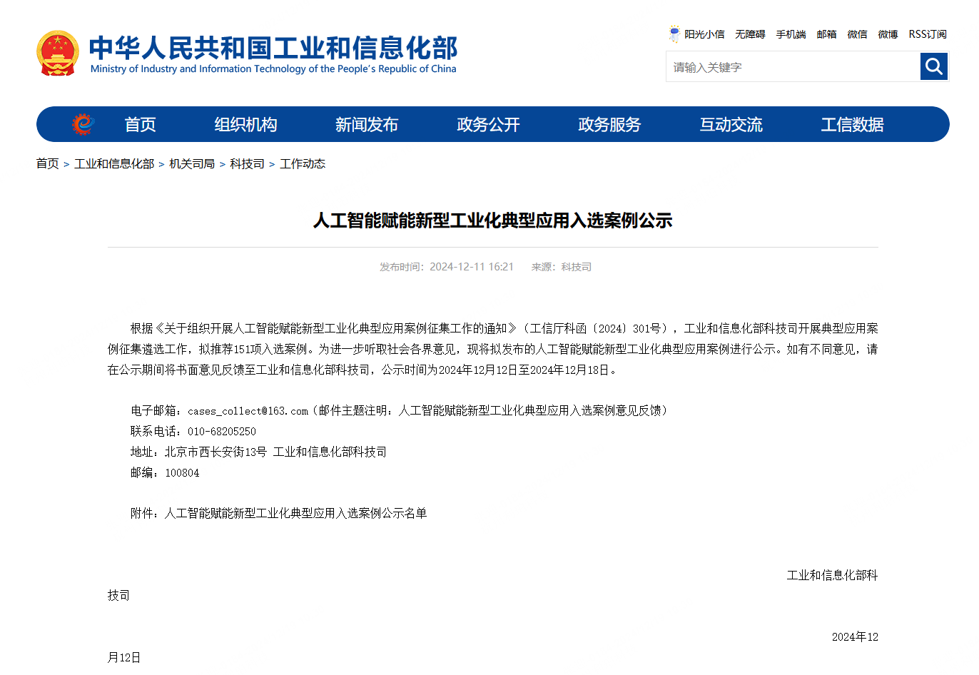 《人工智能赋能新型工业化典型应用入选案例名单》
