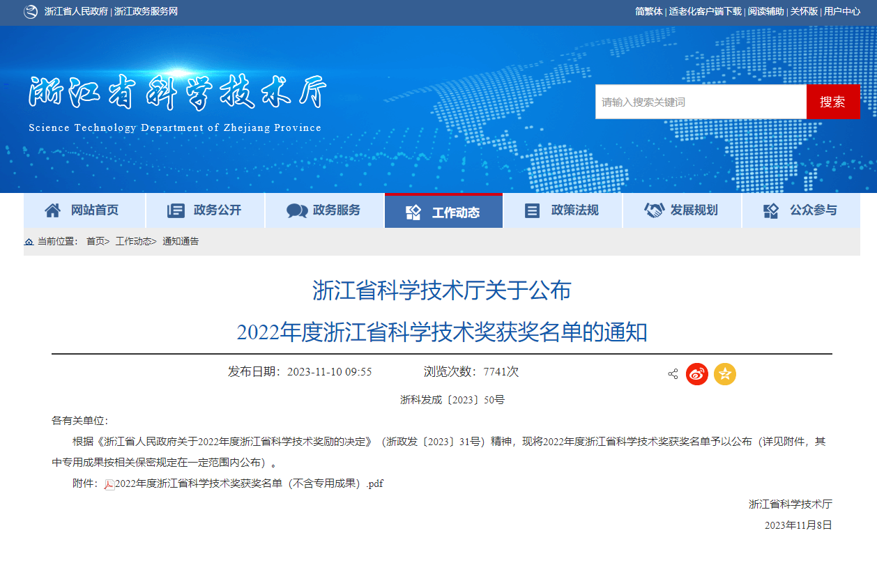 11月10日,省科技厅公布2022年度浙江省科学技术奖获奖名单,乐竞官方版网站登录入口荣获2022年度浙江省科技进步奖一等奖