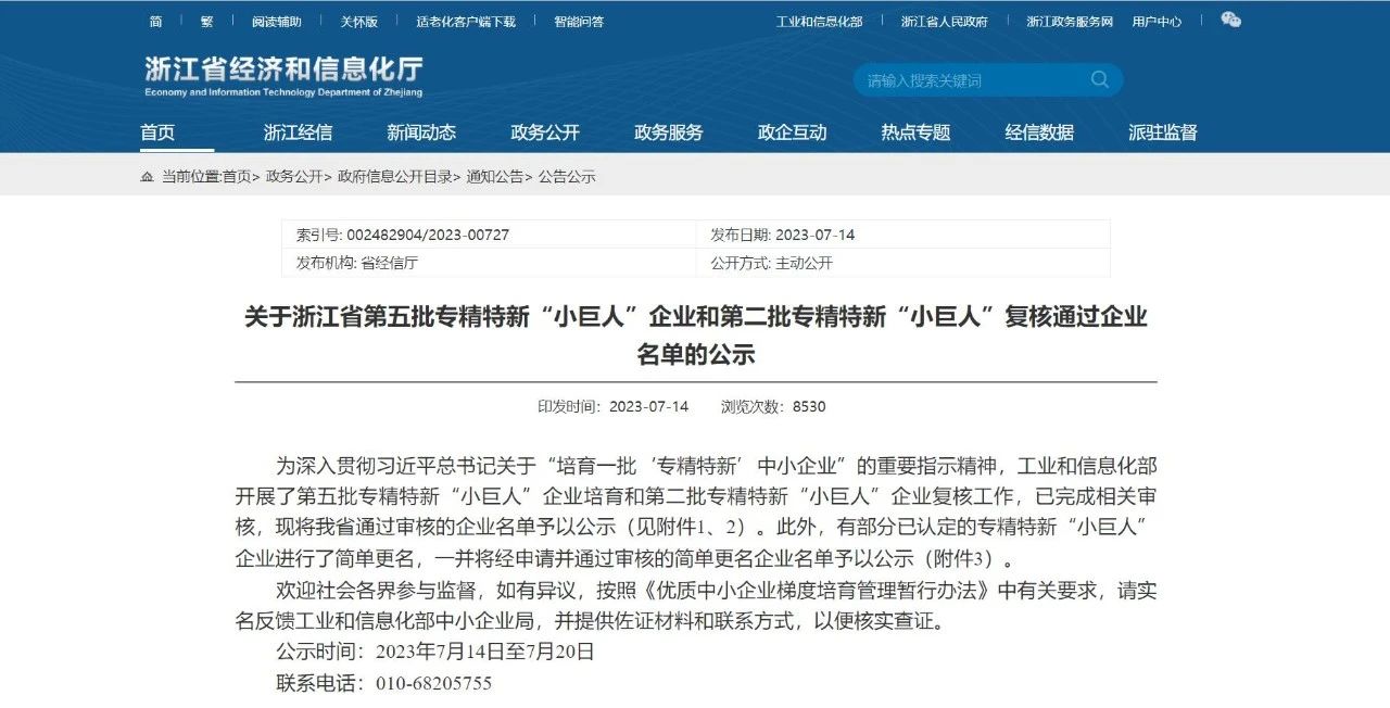 2023年7月,浙江省第五批专精特新“小巨人”企业名单正式公式,利珀科技通过层层严格评审,凭借优异的技术创新能力、突出的成长速度和广阔的发展前景入选该名单,荣获国家级专精特新“小巨人”企业称号。