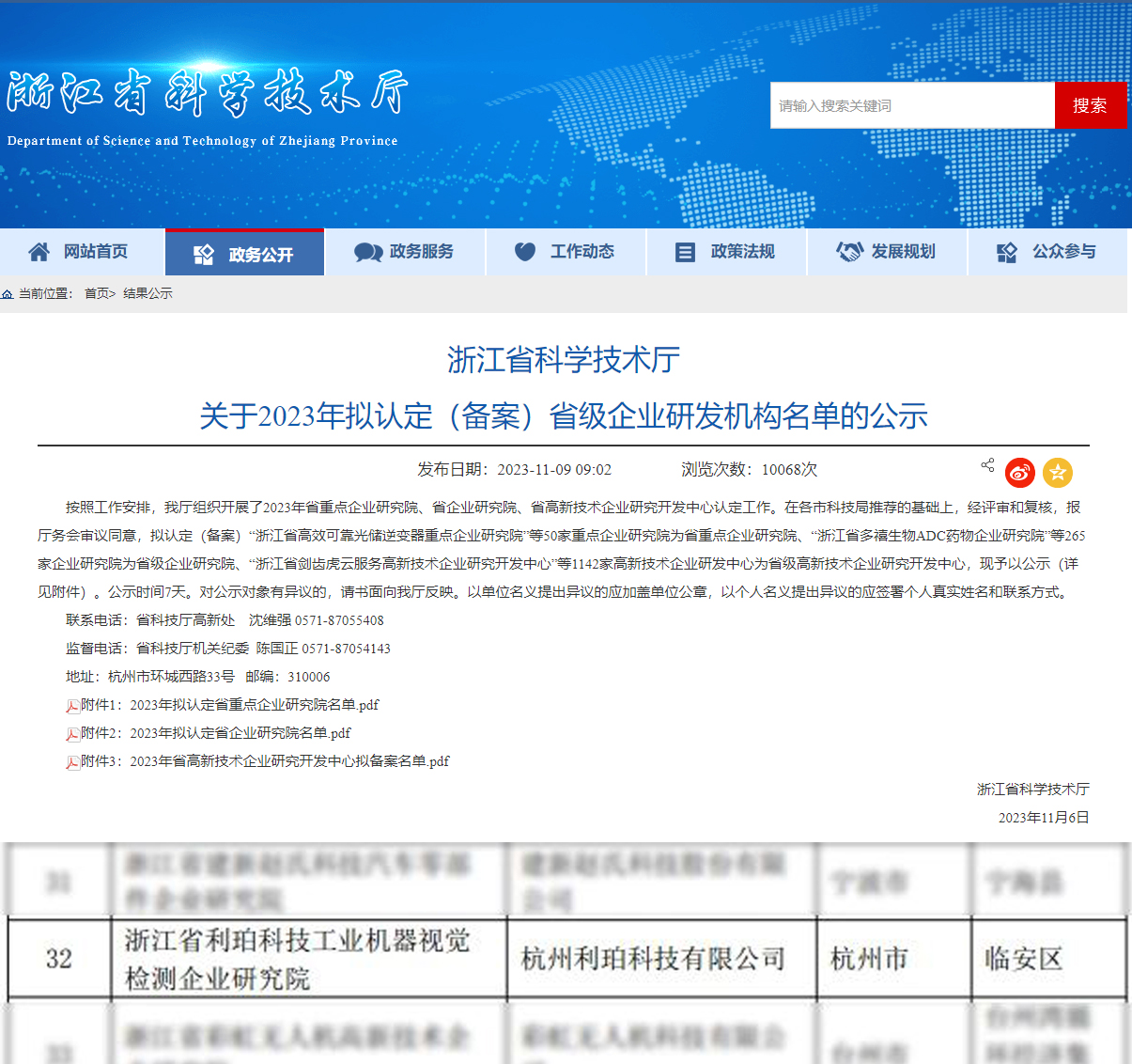 “科技赋能产业,创新引领发展” 11月16日,浙江省科学技术厅公布了2023年新认定省级企业研究院公示名单。凭借着卓越的企业自主创新能力和竞争力,我司申请的“浙江省利珀科技工业机器视觉检测企业研究院”成功获批。
