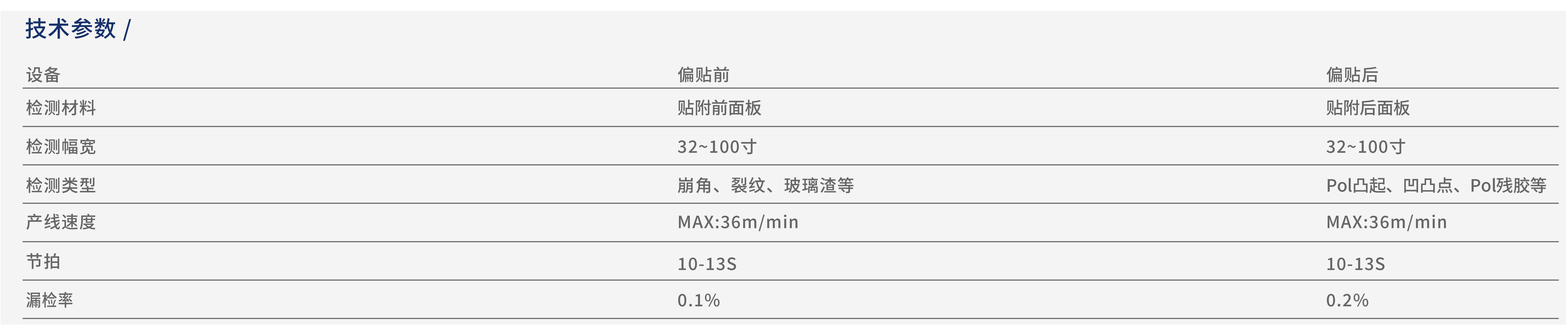 该设备用于RTP产线上Panel贴附前和贴附后的缺陷检测,如贴附前的崩角、裂纹、玻璃渣等;贴附后的Pol凸起、凹凸点、Pol残胶等;检测后的OK/NG结果通过PLC输出,并将缺陷信息传输到目检工位。
